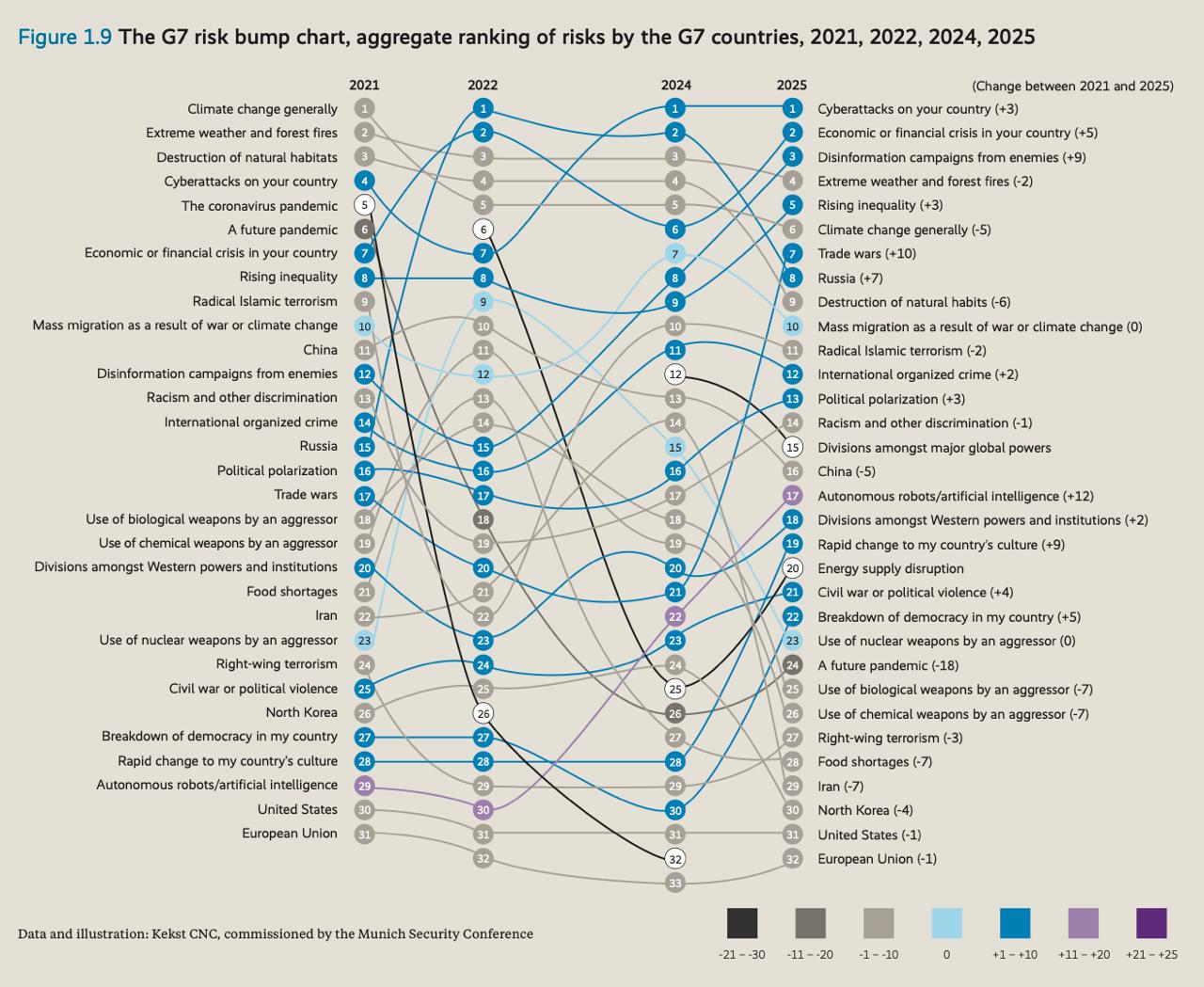 В топе угроз теперь кибератаки, финансовые кризисы, климатические катастрофы и неравенство. Тема России, которая доминировала в 2023 и 2024, ушла сильно вниз. Мюнхен в этом году пройдёт не менее интересно, чем Давос. Участников уже заранее окатили ледяной водой, им теперь приходится впервые в жизни чего-то добиваться без поддержки США. С непривычки будет тяжело.