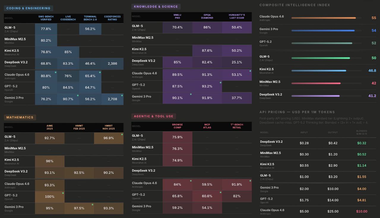 Тем временем, DeepSeek и китайские проекты представили несколько новых открытых моделей с источником кода, которые обещают серьезную конкуренцию для американских аналогов. Minimax M2.5 для программирования, Kimi K2.5, а Zhipu GLM-5. Стоимость использования этих моделей значительно ниже, чем у американских конкурентов. Цена их использования может быть в 3-20 раз ниже, чем у моделей от американских гигантов. @banksta