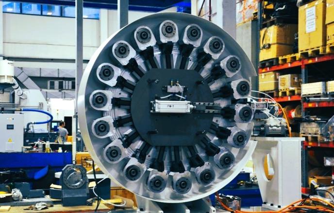 Инструментальный магазин предназначен именно для шлифовальных кругов, а не для стандартного режущего инструмента. Он рассчитан на 18 позиций и обеспечивает автоматическую установку кругов в мотор-шпиндель станка. Ключевая особенность конструкции — возможность работы с кругами в сборе с оправкой.