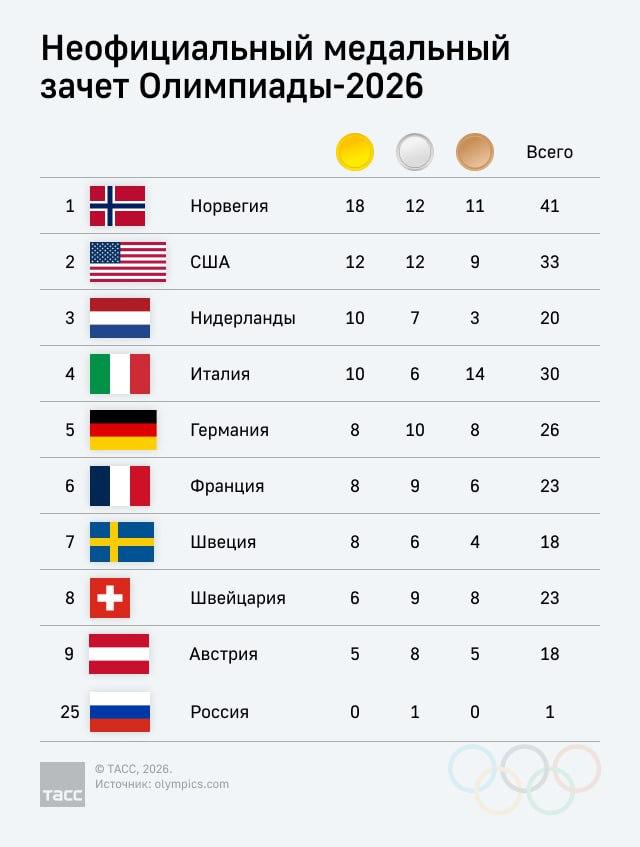 🏅 Победителем медального зачета Олимпийских игр стала сборная Норвегии, завоевавшая 18 золотых, 12 серебряных и 11 бронзовых медалей.