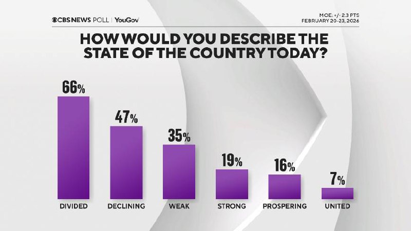Опросы, вышедшие по горячим следам обращения Трампа к нации и Конгрессу, показали, что большинство американцев характеризуют свою страну как ‘разделённую’ и ‘находящуюся в упадке’