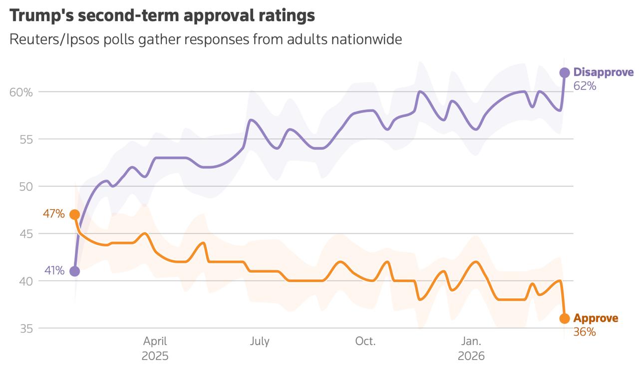 Белый дом на осадном положении. В очередном опросе рейтинг Трампа рухнул сразу на четыре пункта до 36% (https://www.reuters.com/world/us/trumps-approval-hits-new-36-low-fuel-prices-surge-amid-iran-war-reutersipsos-2026-03-24/). Его тянет на дно непопулярность войны в Иране и неважное состояние американской экономики. 70% американцев высказывают недовольство взлётом топливных цен и ростом безработицы.