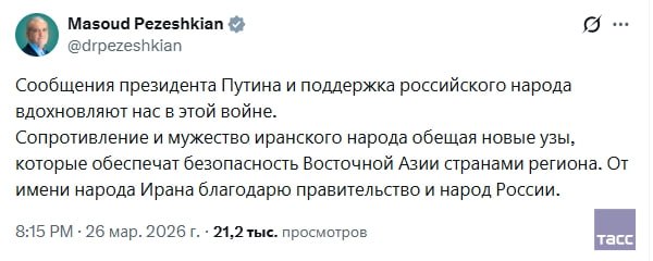 Президент Ирана на своей странице в соцсети X на русском языке поблагодарил Владимира Путина и Россию за поддержку в конфликте с США и Израилем.