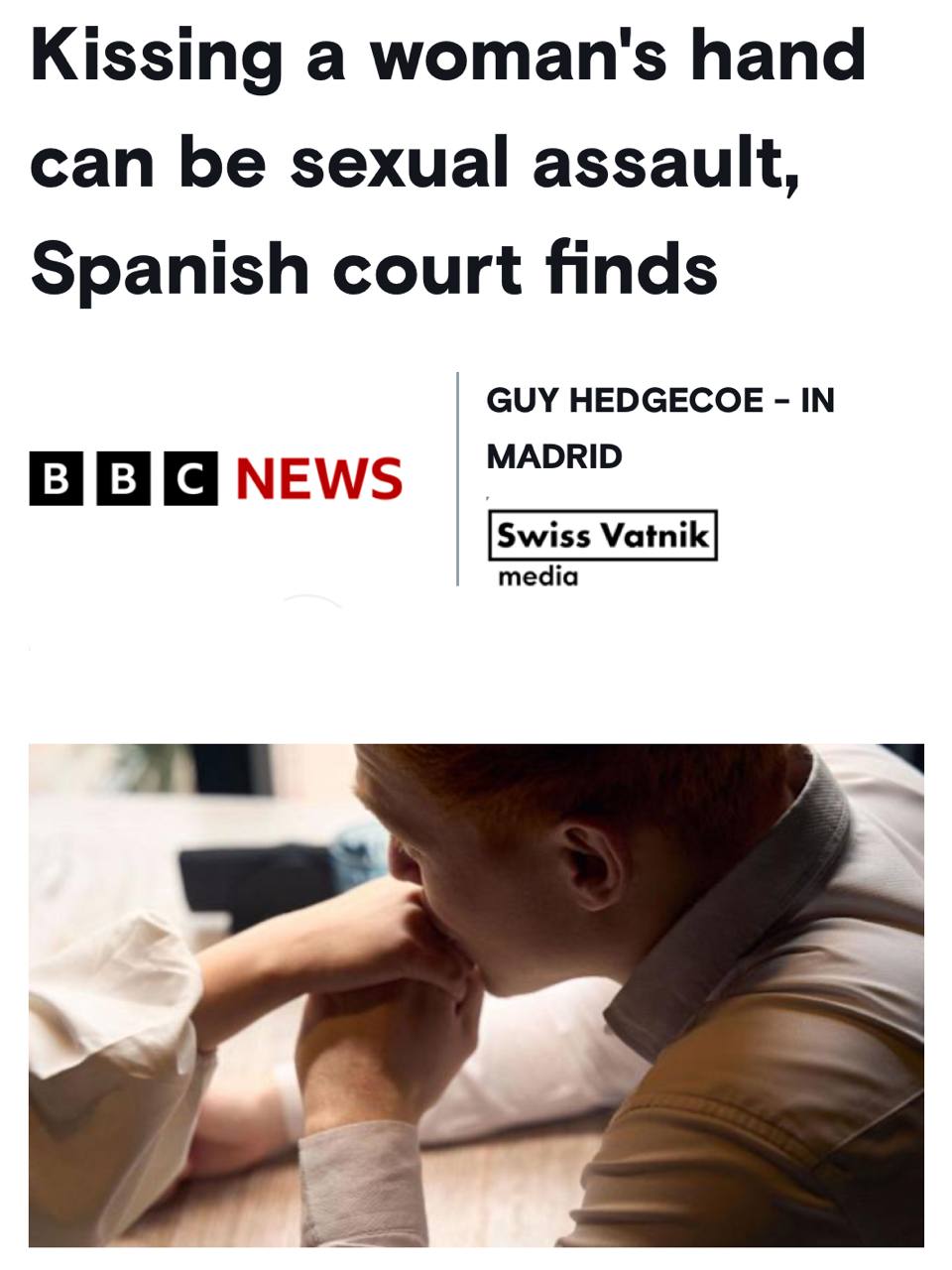 Верховный суд Испании признал поцелуй руки без согласия актом сексуализированного насилия. Решение вынесли по делу от 2023 года, разбирательство велось более трех лет. Инцидент произошел на автобусной остановке в Мадриде. Среди бела дня, незнакомый мужчина дважды поцеловал руку женщине ожидавшей автобуса, после чего жестом предложил ей пойти за ним. Пострадавшая обратилась с жалобой сначала в полицию, а потом в местный суд, который встал на её сторону: