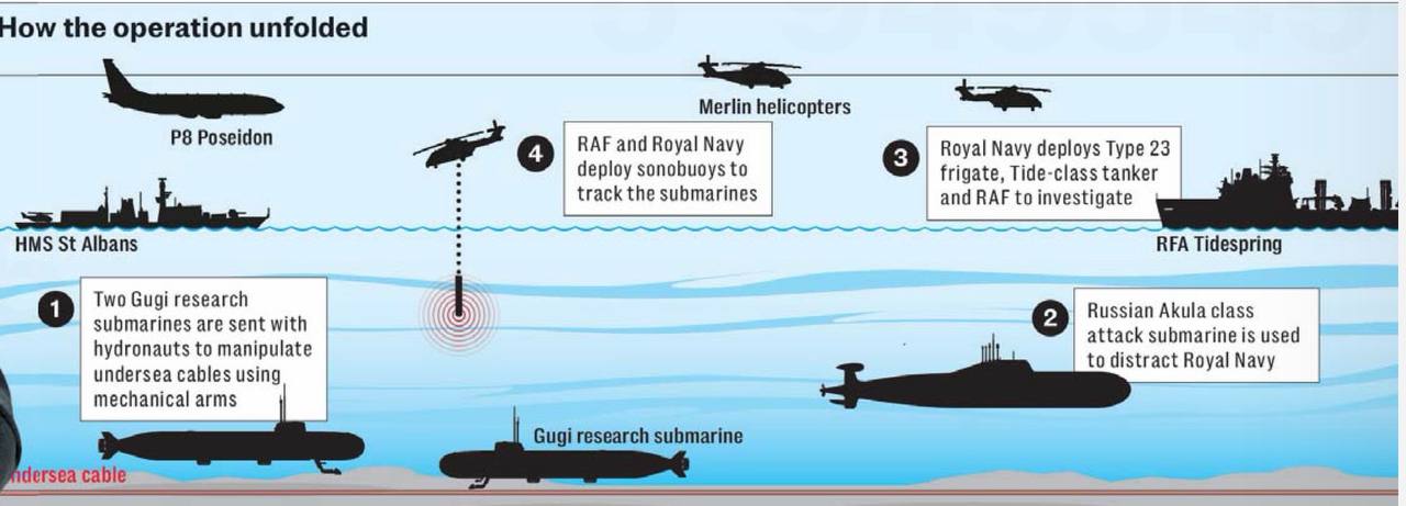 Газета полагает, что наша «Акула» всего лишь отвлекала внимание британских военных, пока две подлодки ГУГИ (Главного управления глубоководных исследований) манипулировали на дне в районе, где проходят подводные кабели потенциального противника.