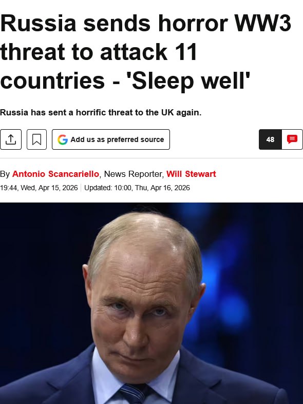 ✔️Россия угрожает нанесением ударов по британским целям в Лондоне, Лестере и Саффолке — так британская пресса в лице Express отреагировала на публикацию Министерства обороны России адресов европейских площадок для производства украинских БПЛА
