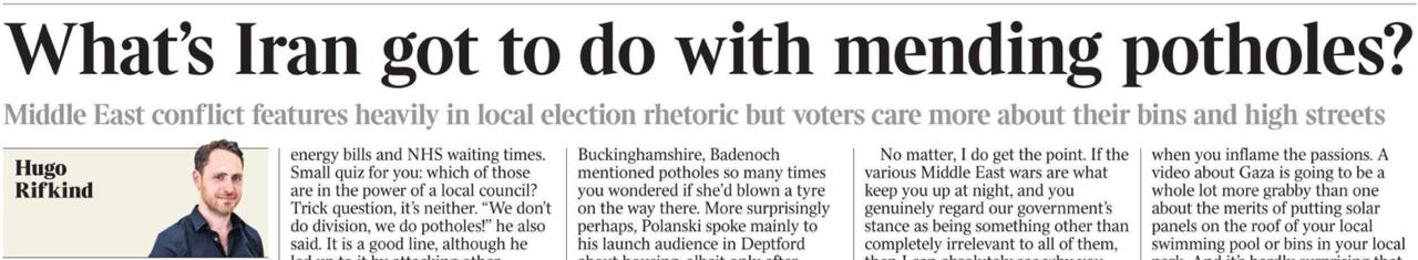 «Какое отношение Иран имеет к заделыванию дорожных ям?» Под таким заголовком колумнист The Times Хьюго Рифкинд сегодня пишет о том же, о чем я на днях написал (//ria.ru/20260413/starmer-2086655176.html) в своей колонке о локальных выборах в Англии.